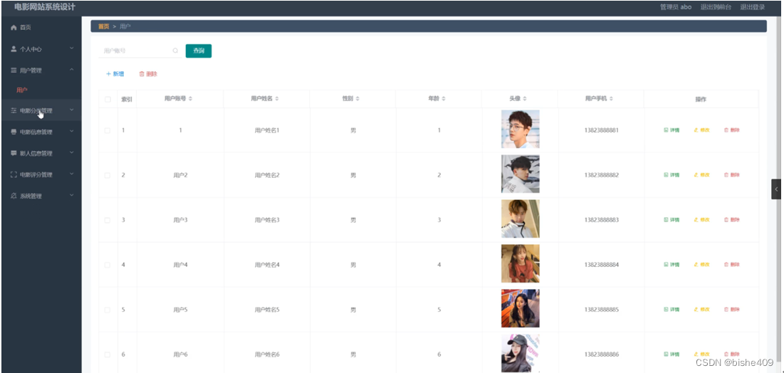 用户管理,在用户管理页面中可以查看索引、用户账号、用户姓名、性别、年龄、头像、用户手机等信息,并可根据需要进行修改或删除等操作,如图4-9所示。