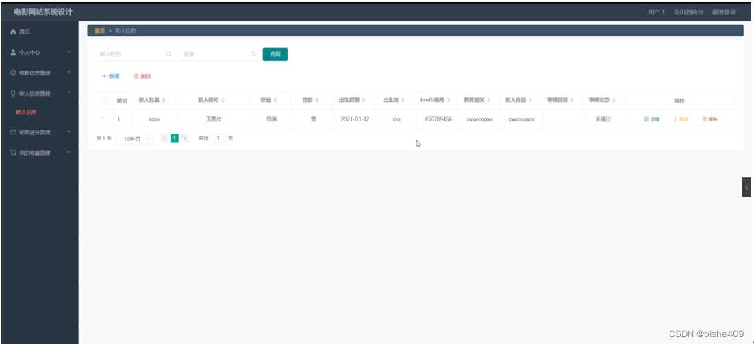 影人信息管理,在影人信息管理页面中可以查看索引、影人姓名、影人照片、职业、性别、出生日期、出生地、imdb编号、获奖情况、影人作品、审核回复、审核状态等信息,并可根据需要进行修改或删除等操作,如图4-18所示。