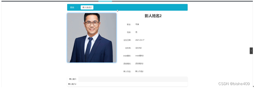 影人信息,在影人信息页面可以查看影人姓名、影人照片、职业、性别、出生日期、出生地、imdb编号、获奖情况、影人作品等信息,如图4-4所示。