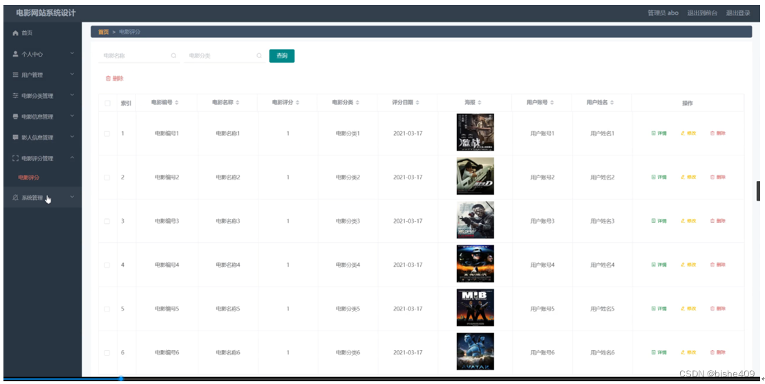 电影评分,在电影评分页面可以查看电影编号、电影名称、电影评分、电影分类、评分日期、海报、用户账号、用户姓名等信息,如图4-5所示。