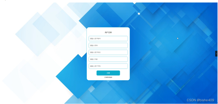 用户注册,在用户注册页面通过填写用户账号、密码、用户姓名、年龄、用户手机等信息完成用户注册,如图4-2所示。