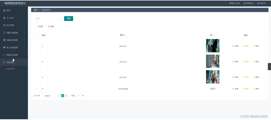 系统管理,在轮播图管理页面中可以查看索引、名称、值等信息,并可根据需要进行修改或删除等操作,如图4-14所示。