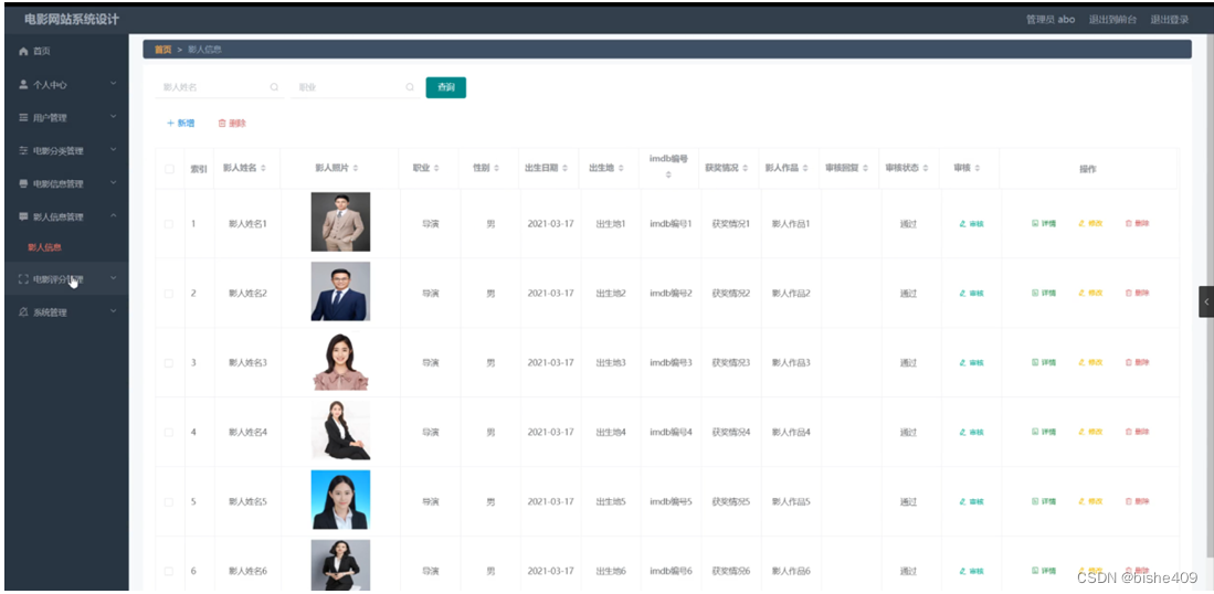 影人信息管理,在影人信息管理页面中可以查看索引、影人姓名、影人照片、职业、性别、出生日期、出生地、imdb编号、获奖情况、影人作品、审核回复、审核状态、审核等信息,并可根据需要进行修改或删除等操作,如图4-12所示。