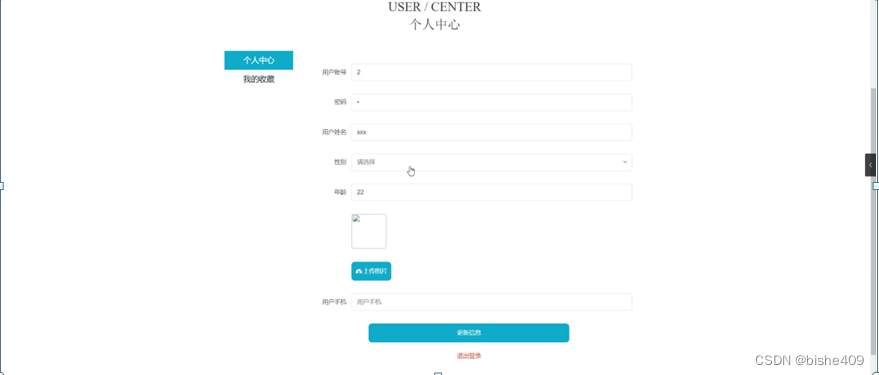个人中心,在个人中心页面通过填写用户账号、密码、用户姓名、性别、年龄、用户手机等信息进行更新信息,根据需要对我的收藏进行相对应操作,如图4-6所示。