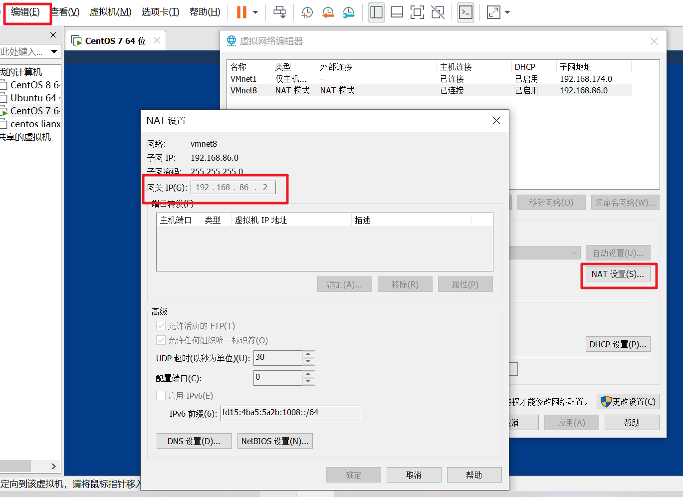 1.查看自己网关,编辑-虚拟网络编辑器-NET设置-网关ip