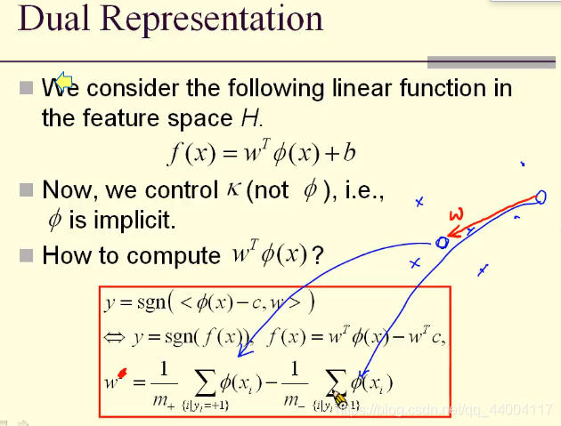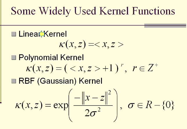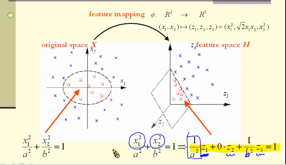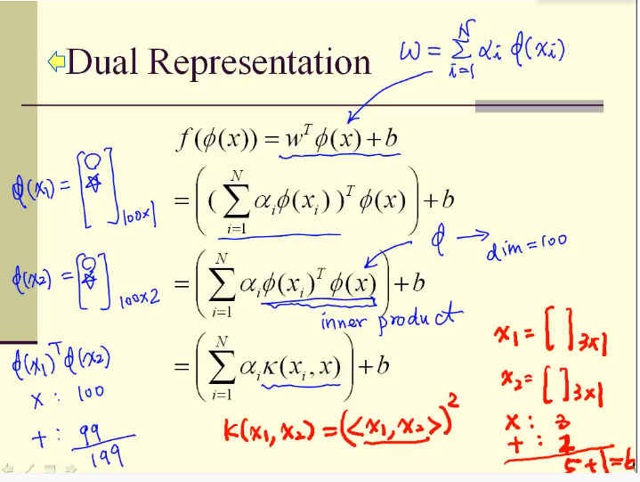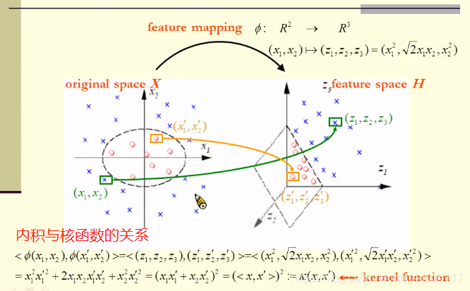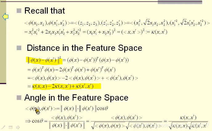 2维空间映射到3维空间后,内积可以用K函数表示。而内积可以用来计算高维度空间的距离和角度,因此不需要映射关系Φ ,仅通过K函数即可计算高维度空间的距离和角度。