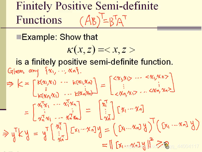 证明k(x,z)=<x,z>对应的kernel function是正半定矩阵。