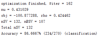 [predicted_label, accuracy, decision_values] = svmpredict(heart_scale_label,heart_scale_inst,model);计算结果如下: