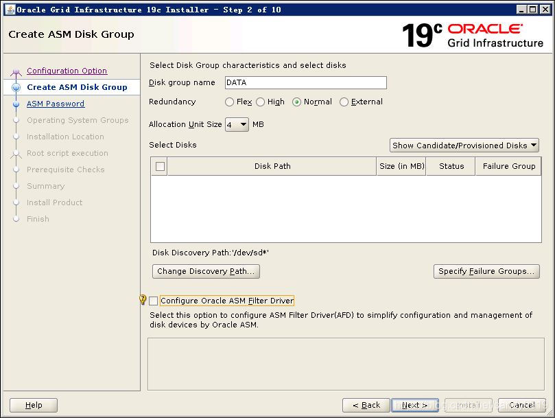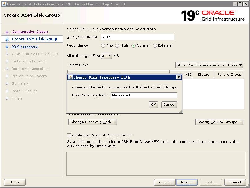 磁盘组名称“DATA”,点选“chang discovery path”发现asm磁盘