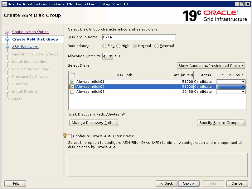 RHEL 7.6 安装oracle database 19c on ASM Part3: ASM磁盘组配置