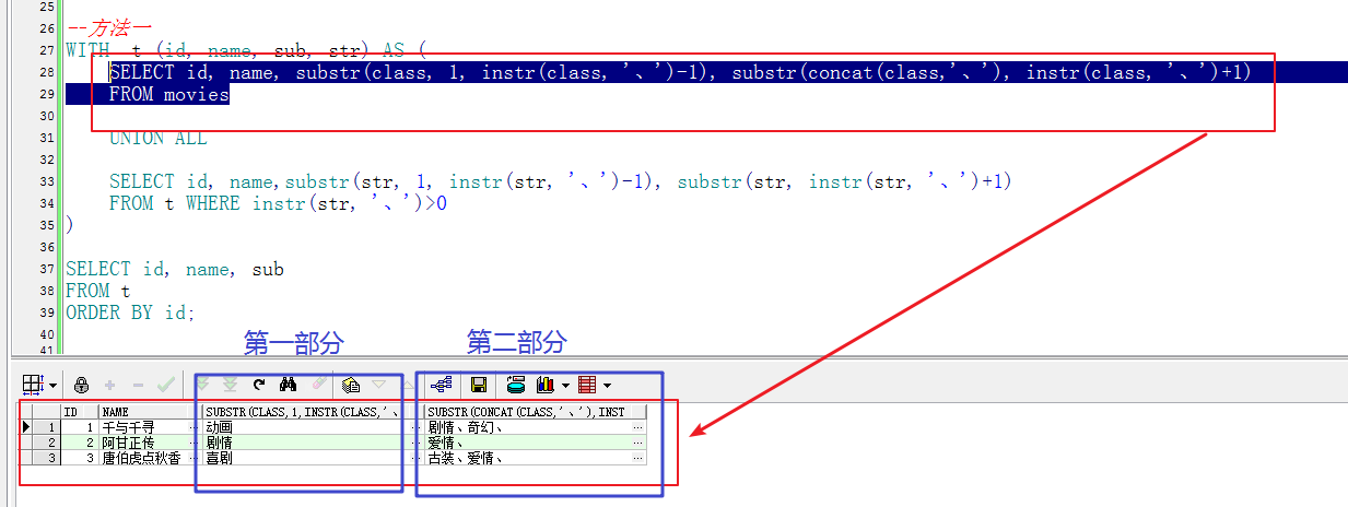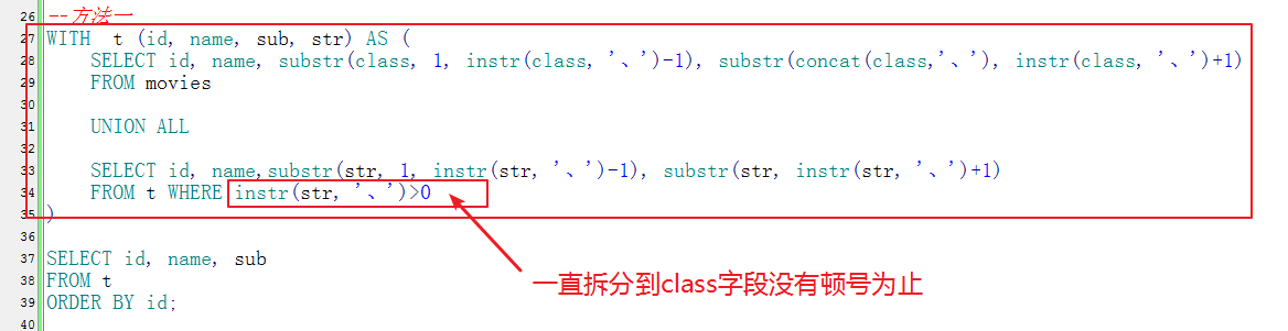 2.第二步利用WITH表达式实现递归查询,根据分隔符(此处为顿号)循环将第一步操作中未拆分的值(第二部分)进行拆分,一直拆分到字段的最后一个分割符为止,递归结束的数据放在临时表t中。