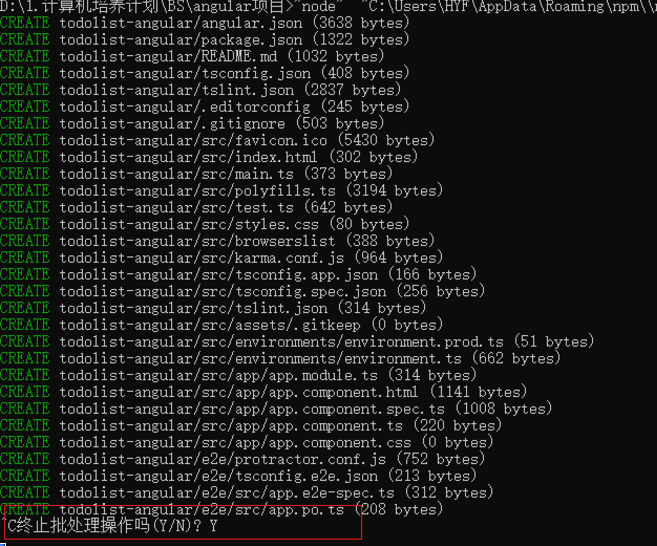 ng new todolist-angular出现下面的图样,绿色字体出现完之后使用 ctrl+c 终止进程,打断进程的原因是通过这个命令初始化项目之后它会自动帮我们使用npm 来下载第三方包,但是npm 是通过外网来下载的,由于网络的原因很容易撞墙,所以我们要打断