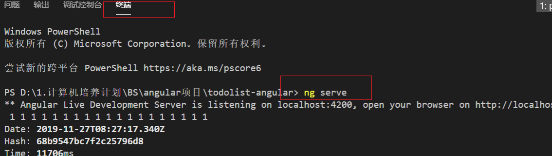 - 如果我们在DOS中已经 使用 ng serve 启动了 angular项目 那么就无法再次通过VS Code的终端来启动项目,因为两个发生抢夺端口的现象。
