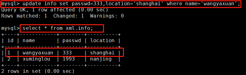 mysql> use xml; (使用数据库xml)