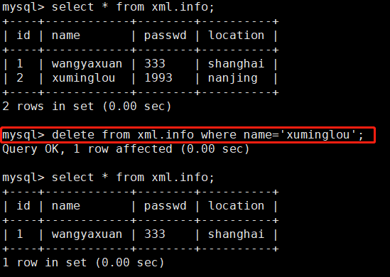 mysql> drop table xml.info; (删除数据表xml)
