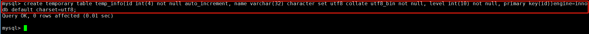 mysql> create temporary table temp_info(id int(4) not null auto_increment, name varchar(32) character set utf8 collate utf8_bin not null, level int(10) not null, primary key(id))engine=innodb default charset=utf8;