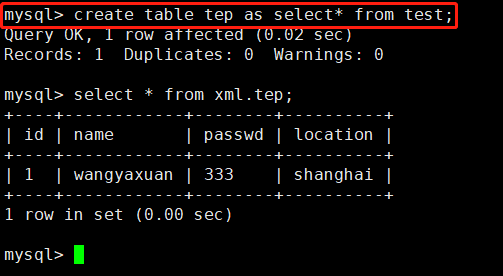 新建一个tmp表,读取test表中的所有内容放入tmp表