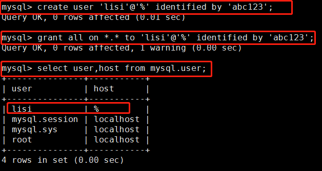 #设置登录密码为abc123的lisi用户,可以从任意终端登录,对所有库和所有表有全部权限