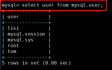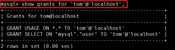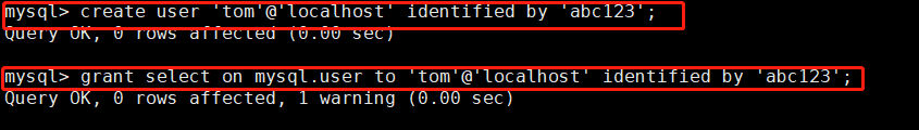 #设置登录密码为abc123的tom用户,可以从本地终端登录,对mysql库中的user表有select权限