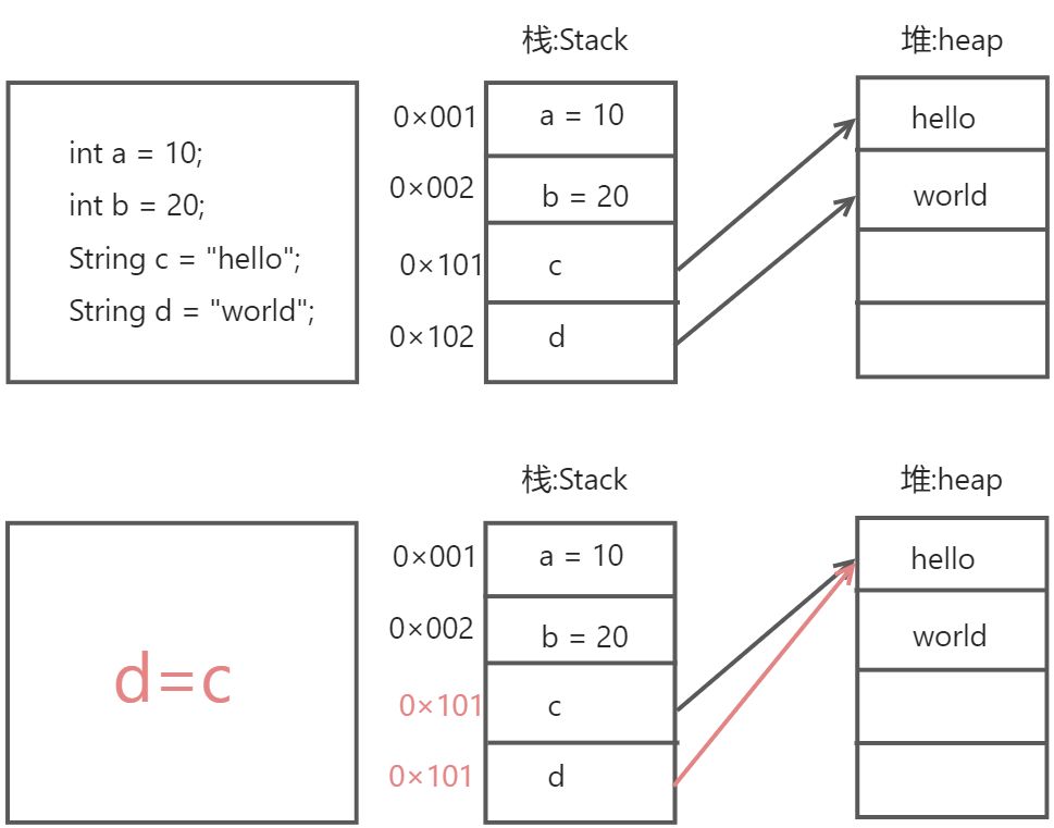 上图定义的 a 和 b 都是基本类型,其值是直接存放在栈中的;而 c 和 d 是 String 声明的,这是一个引用类型,引用地址是存放在 栈中,然后指向堆的内存空间。