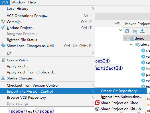 在Idea菜单栏中依次选择VCS => Import into Version Control => Create Git Repository,然后选择自己的项目根目录,就会自动帮你初始化成git项目。