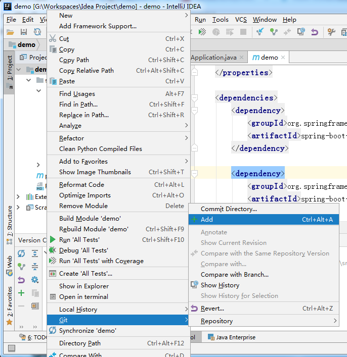右键点击项目,选择 Git => Add,将我们需要提交的代码添加到待提交区