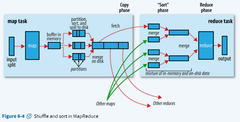 当一个map task处理的数据很大,以至于超过缓冲区内存时,就会生成多个spill文件。此时就需要对同一个map任务产生的多个spill文件进行归并生成最终的一个已分区且已排序的大文件。配置属性mapreduce.task.io.sort.factor控制着一次最多能合并多少流,默认值是10。这个过程包括排序和合并(可选),归并得到的文件内键值对有可能拥有相同的key,这个过程如果client设置过Combiner,也会合并相同的key值的键值对(根据上面提到的combine的调用时机可知)。