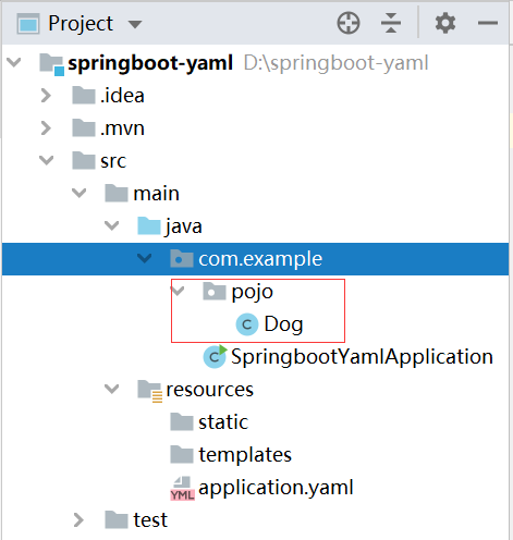 2.在与SpringbootYamlApplication文件同级的目录下建立一个新的实体类,为了方便,我们简单的创建一个Dog的实体。创建之前记得让Dog实体单独存在于pojo包中。