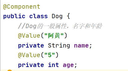 3.接下来,我们到了给配置文赋值的时候了。首先来看第一种,即采用最简单的@Value()来赋值。如直接在Dog.java中为Dog赋值: