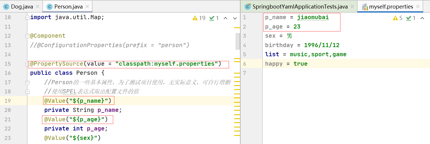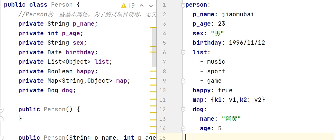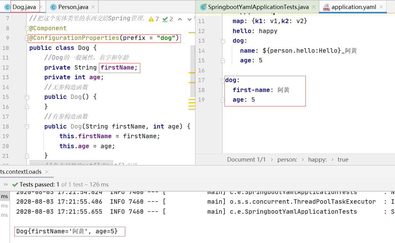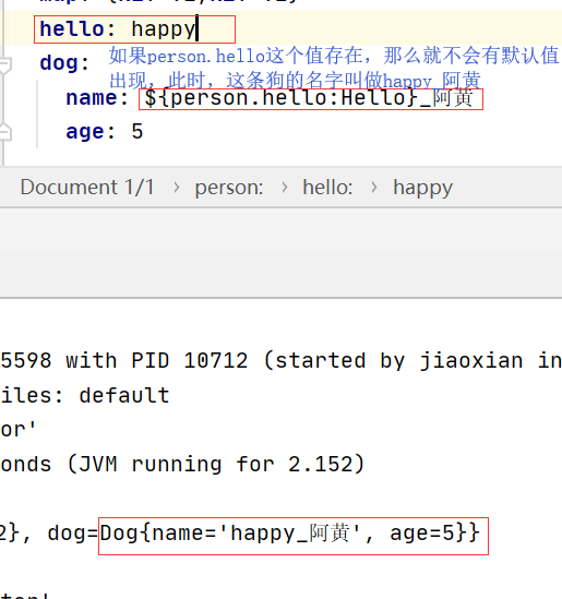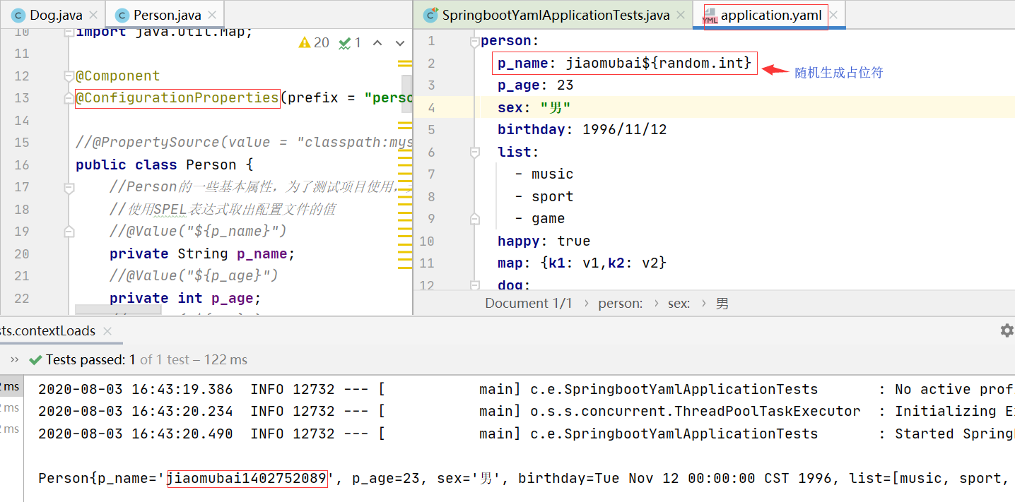 尽管此种方法也能成功运行,但是这一般只适用于对象的属性较少的情况,比如我们使用的Dog及只有两个属性,这种情况下我们可以挨个给每个属性使用@Value()方法来赋值,但是当遇到属性较多的情况,比如我们的Person,此时如果继续使用@Value()方法的话,显然很费时间,那么此时第二种方法yaml就该派上用场了。