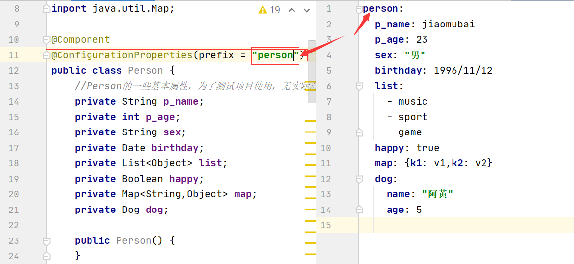 如果我们能够直接右边的这些值赋给左边的各个属性,那Person的对象就有值了,也就不用去new、去set()了。在实体类上写上@ConfigurationProperties(prefix = "person")