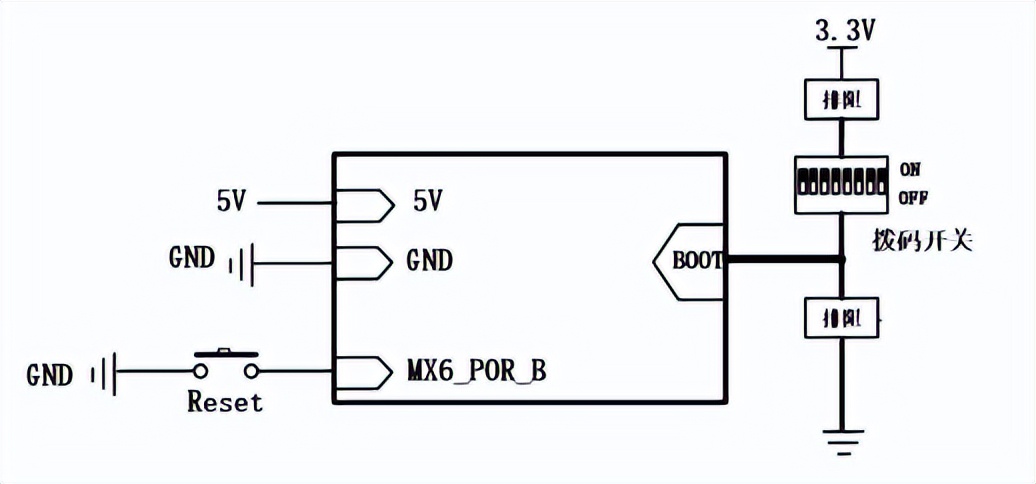 FETMX6ULL-C核心板已经将电源、复位监控电路、存储电路集成于一个小巧的模块上,所需的外部电路非常简洁,构成一个最小系统只需要 5V 电源、复位按键、启动配置即可运行,如下图所示: