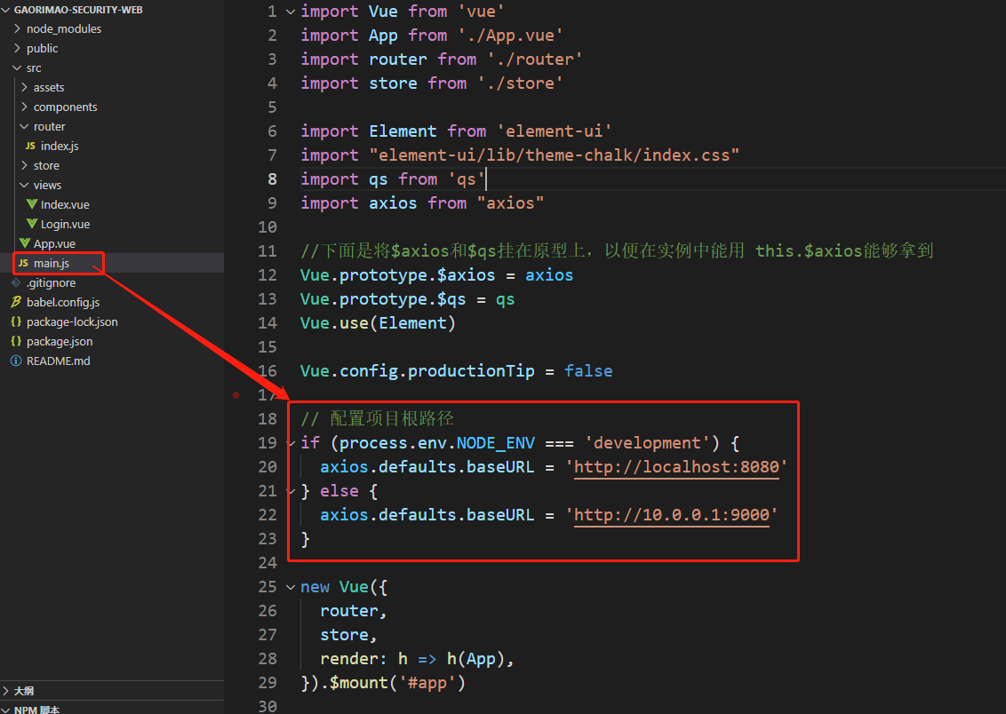 还存在一个问题就是不同环境的ip+端口不一致,我们在开发环境是http:localhost:9001,到了生产环境可能是http://10.1.1.1:7777等,那么我们不可能一直改所有axios请求的代码,所以要把根路径提取出来,分环境配置