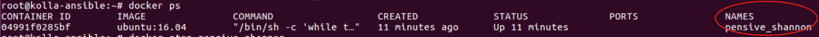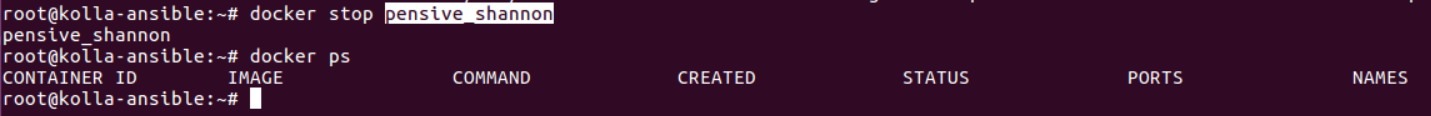 所以命令改为docker stop pensive_shannon,执行完之后用docker ps命令查看,成功停止了容器。
