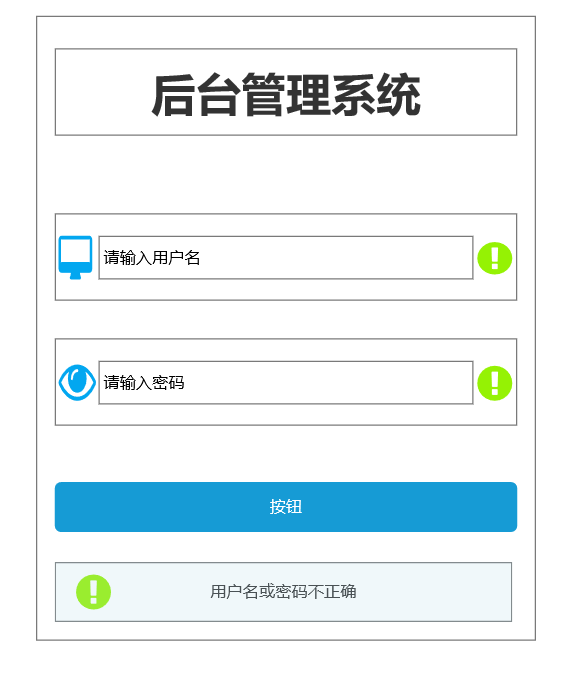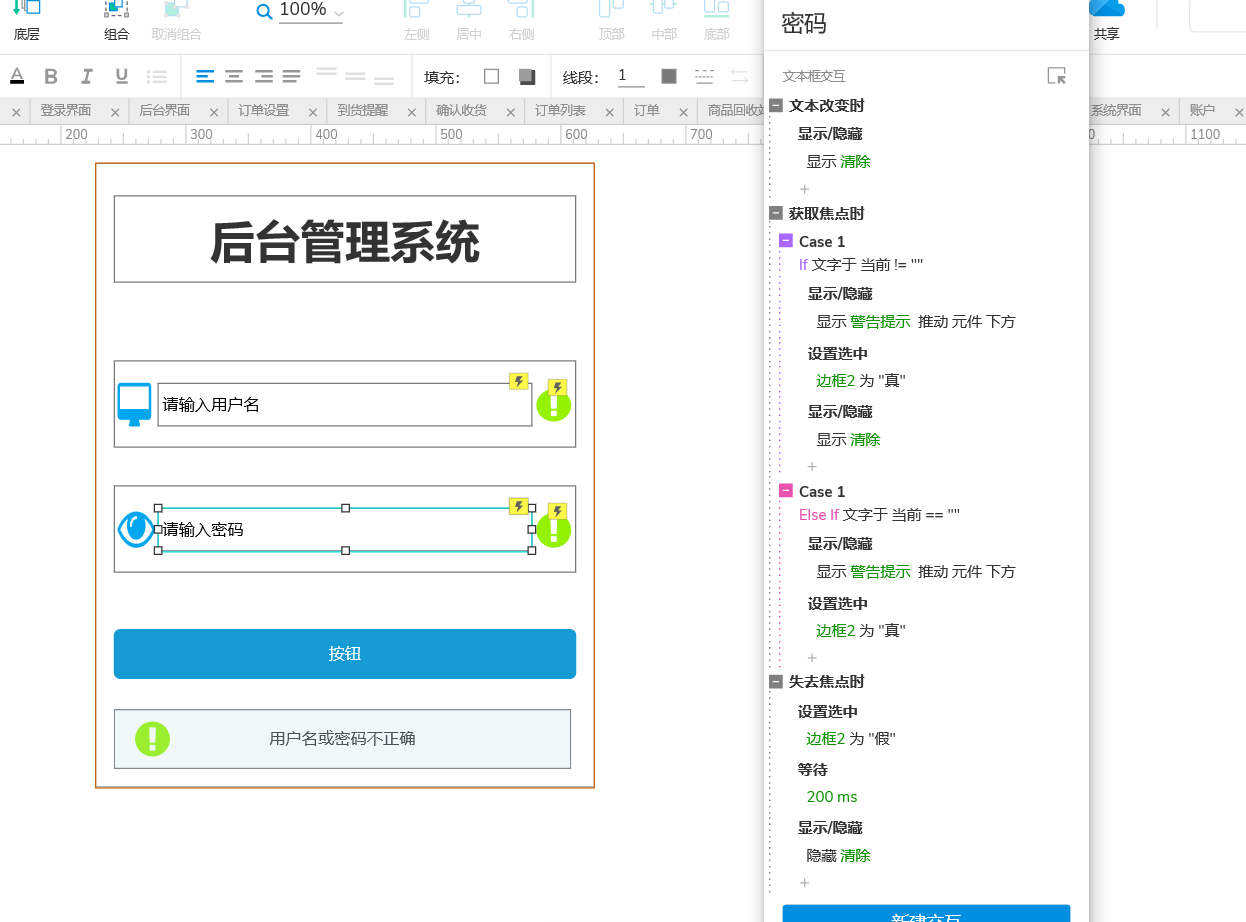 - 然后复制矩形2两个,分别命名为边框1,边框2,然后在边框1,2中放入两个文本框,w为300,h为35,并为第一个文本框命名为"用户名",第二个命名为"密码",然后拖入四个图标分别放入边框1,2当中(感叹号命名为清除)。