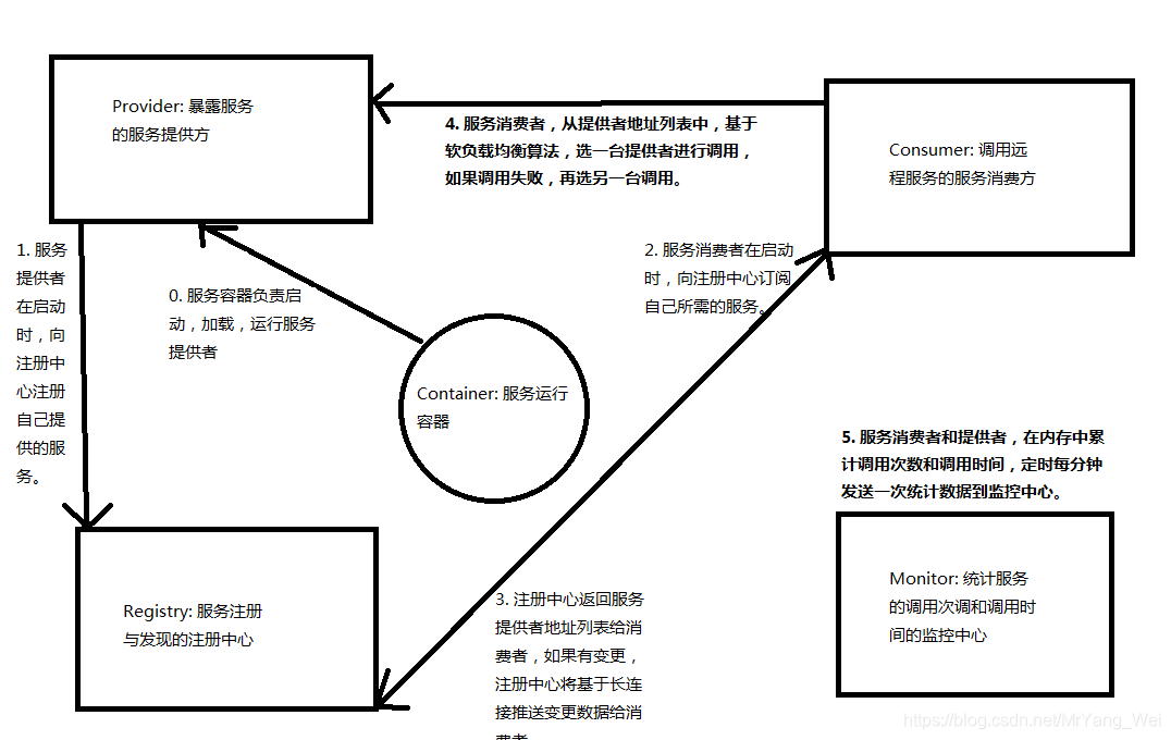 4. 服务消费者,从提供者地址列表中,基于软负载均衡算法,选一台提供者进行调用,如果调用失败,再选另一台调用。