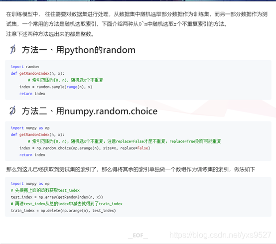 EG: def getRandomIndex(n, x): # form n samples choice x the number of samples # return index of samples that had been choiced and rest index_choiced = np.random.choice(np.arange(n), size=x, replace=False) index_rest = np.delete(np.arange(n), index_choiced) return [index_choiced, index_choiced]