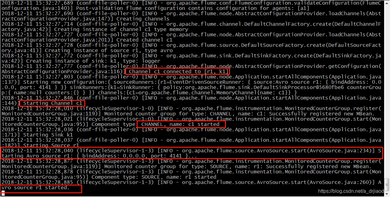 [root@master bin]# flume-ng agent -n a1 -c /usr/flume/conf/ --conf-file /usr/flume/conf/avro.conf -Dflume.root.logger=INFO,console参数解释: