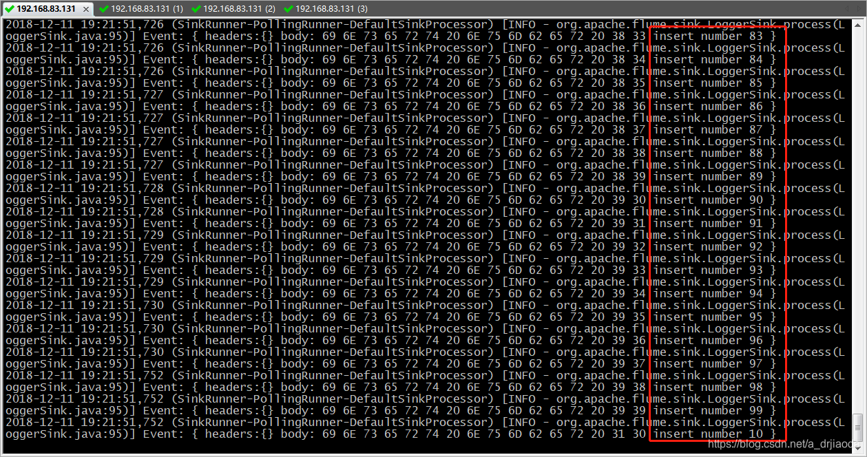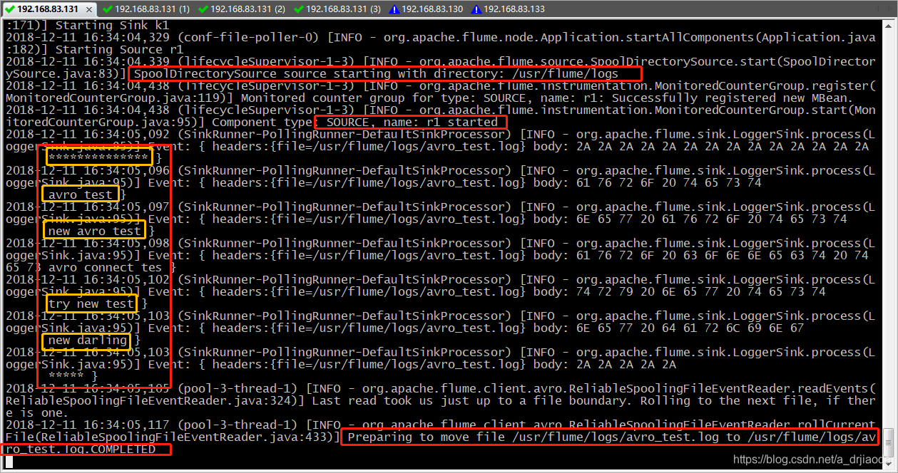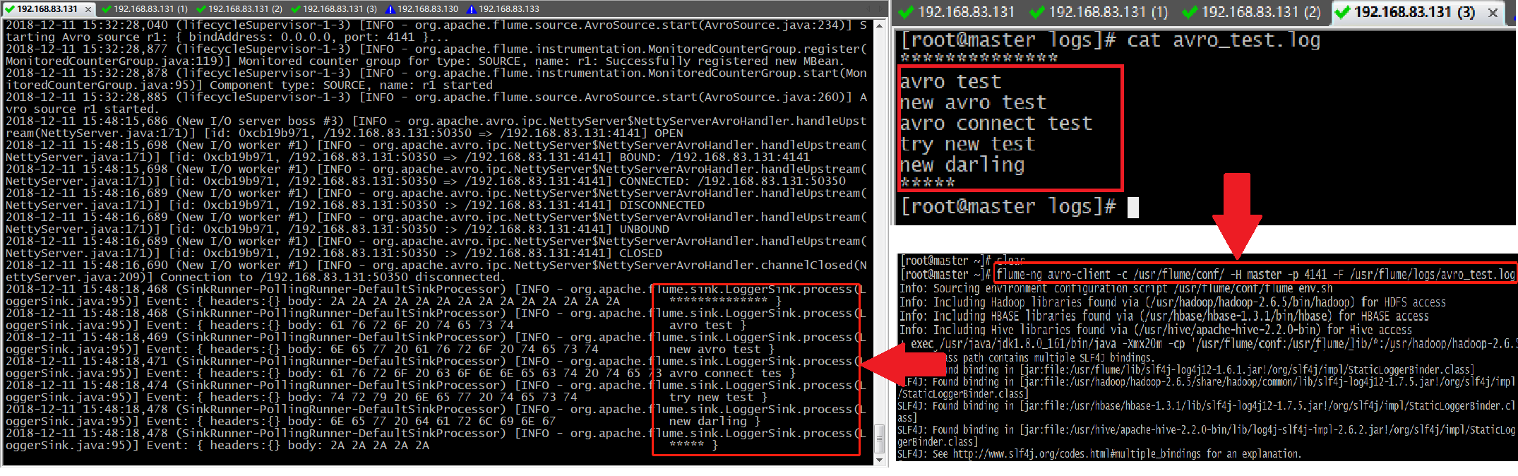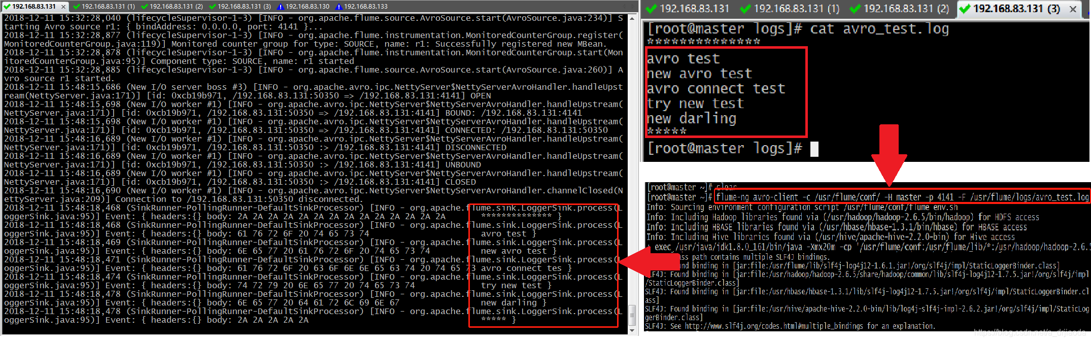 [root@master ~]# flume-ng avro-client -c /usr/flume/conf/ -H master -p 4141 -F /usr/flume/logs/avro_test.log5、最后我们来查看一下结果,在运行上面的命令之后,agent界面中会显示avro_test.log中的文件内容,下图的字比较小,为了更好的理解,我把几张图拼在一起。