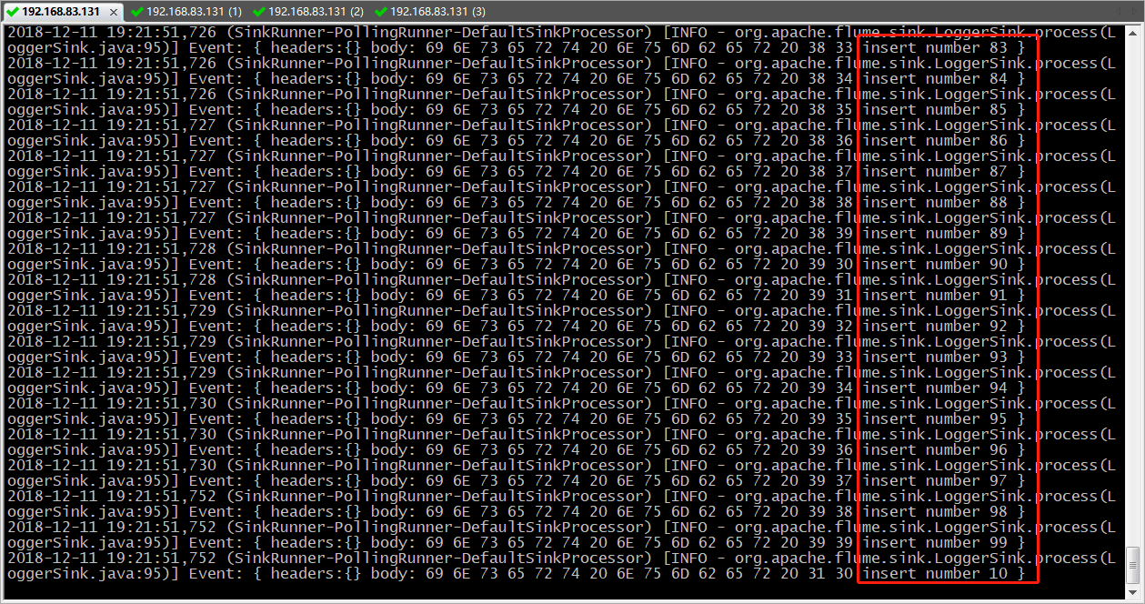 4、如果要使用tail命令,必选使得file足够大才能看到输出内容,因此为了让agent界面能够监控到tail之后的结果,我们往监控的文件中循环插入100条数据: