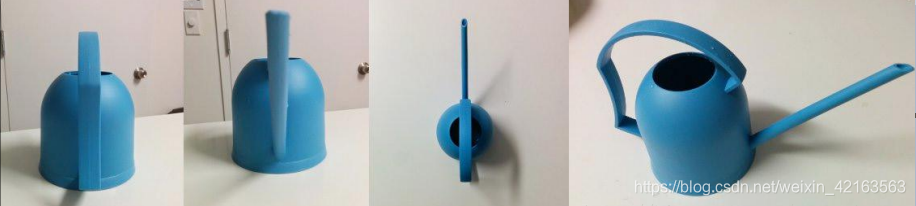 假如你是一本养花工具宣传册的摄影师,你正在拍摄一个水壶。水壶是三维的,但是照片是二维的,为了更全面的把水壶展示给客户,你需要从不同角度拍几张图片。下图是你从四个方向拍的照片: