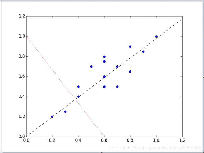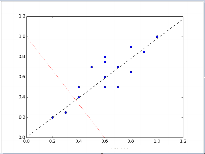 显然,样本映射到黑色虚线的变化比映射到红色点线的变化要大的多。实际上,这条黑色虚线就是第一主成分。第二主成分必须与第一主成分正交,也就是说第二主成分必须是在统计学上独立的,会出现在与第一主成分垂直的方向,如下图所示: