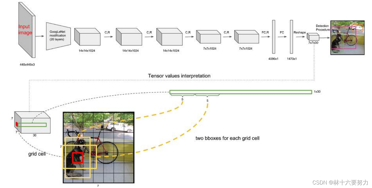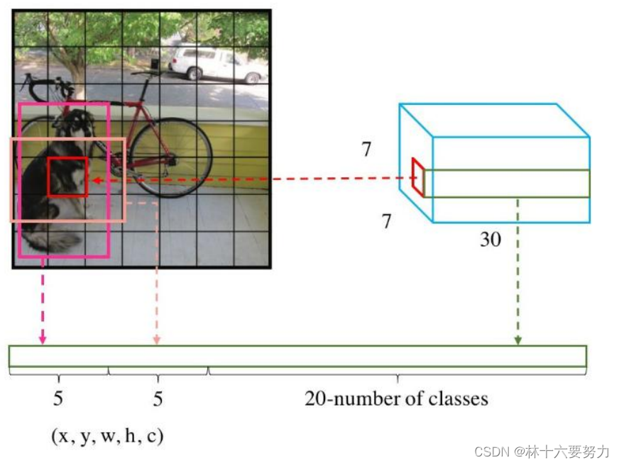 注:关于 7×7×30的预测结果,是指将图像分为7*7的网格,同时30中,1~5代表第一个先验框的(x,y,w,h)以及置信度c,6~10代表第二个先验框,11~30代表对应20个类别的预测概率