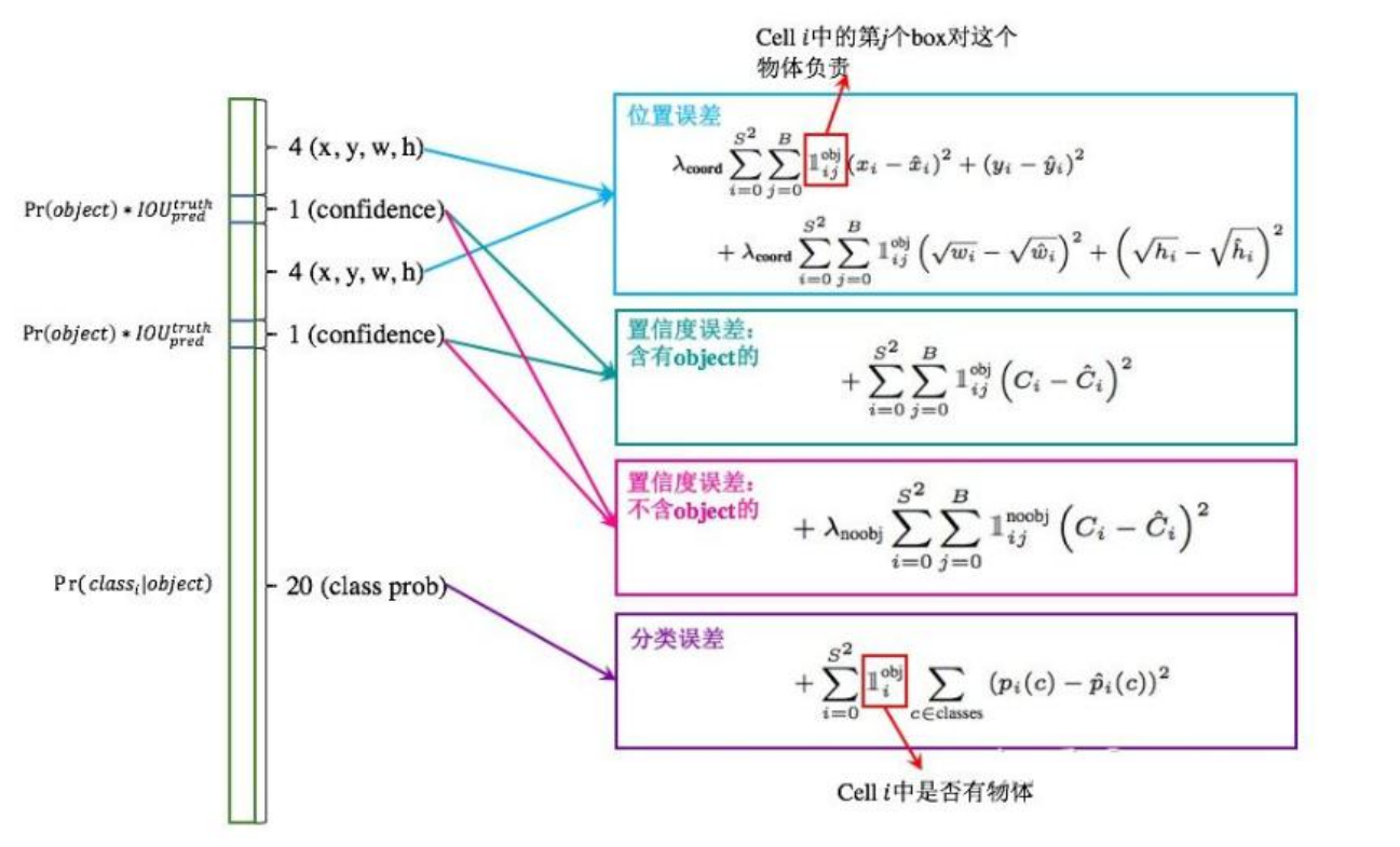 总的来说,将网格数量定义为S*S,定义B个先验框,预测C个类别,那么输出结果即为S×S×(5×B+C)的矩阵向量