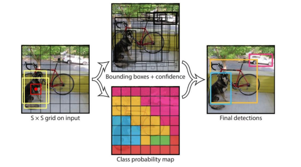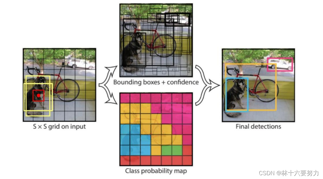 将输入的图像分为S*S的格子,对于每个格子为中心给出两个先验框,对于置信度高的格子(即位于物体中心的格子)通过回归任务将两个先验框调整至合适的大小,然后选择IOU指标较大的框作为预测结果