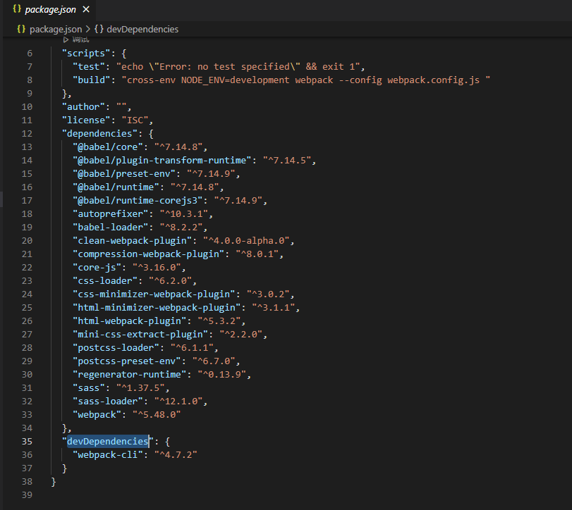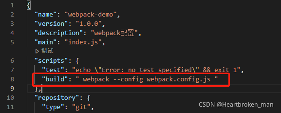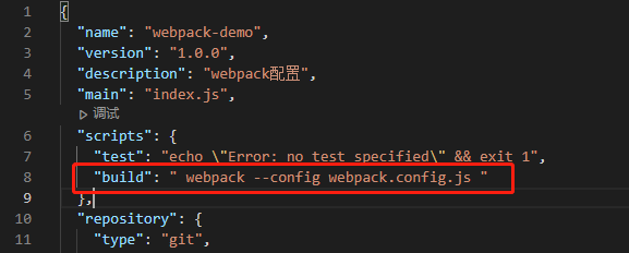 在你创建好的package.json文件里面的scripts字段那里新增这样一行,配置一下webpack执行的文件路径,同时创建一下webpack.config.js文件放在项目根目录下面