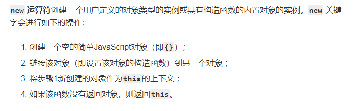 这个在面试中经常会碰到,其实很简单,只要理解new运算符做了什么就可以了。去MDN上查找关于new运算符的解释: