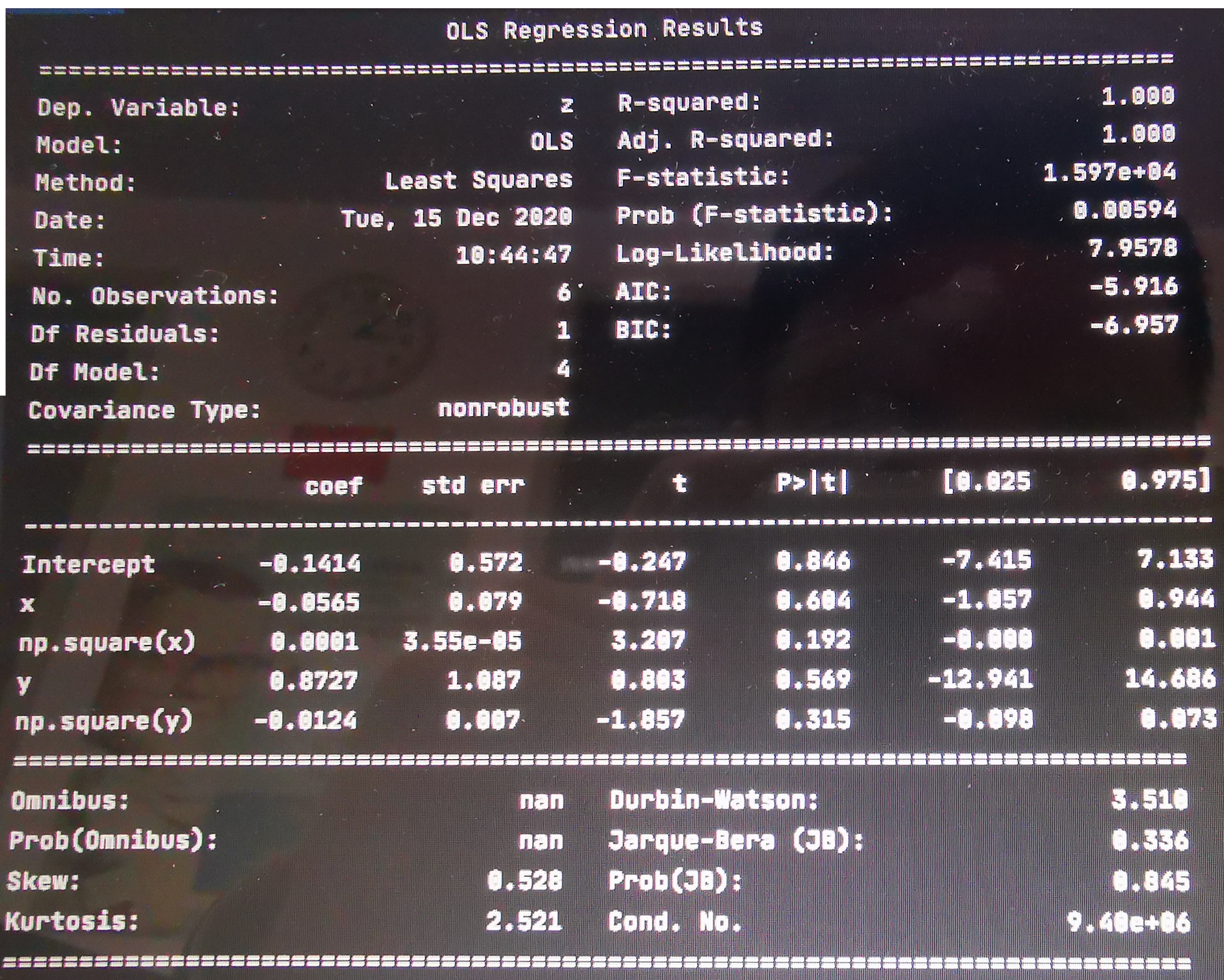 Covariance Type:协方差阵的稳健性,在本例中是nonrobust,这个参数的原理过于复杂,想详细了解的朋友可以自行查询相关资料。不过在大多数回归模型中,我们完全可以不考虑这个参数。