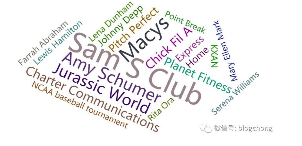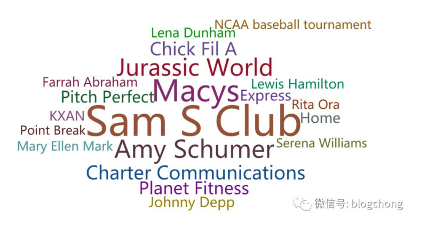 2 name =['Sam S Club', 'Macys', 'Amy Schumer', 'Jurassic World', 'Charter Communications', 'Chick Fil A', 'Planet Fitness', 'Pitch Perfect', 'Express', 'Home', 'Johnny Depp', 'Lena Dunham', 'Lewis Hamilton', 'KXAN', 'Mary Ellen Mark', 'Farrah Abraham', 'Rita Ora', 'Serena Williams', 'NCAA baseball tournament', 'Point Break']