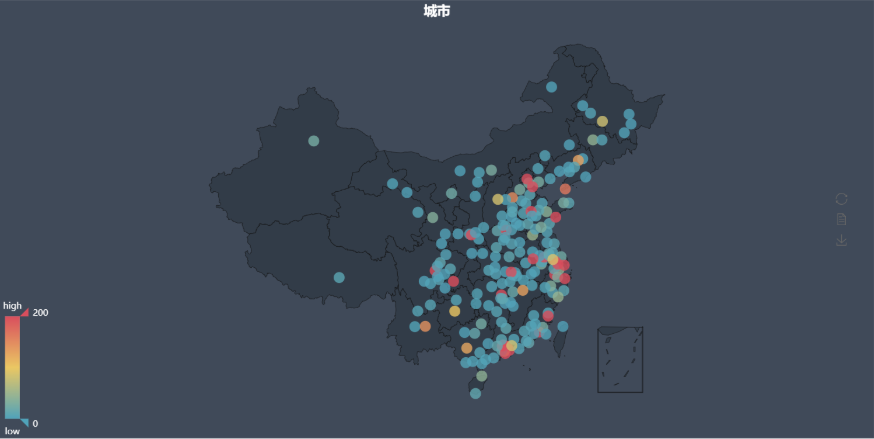 3 geo =Geo("全国主要城市空气质量", "data from pm2.5", title_color="#fff", title_pos="center", width=1200, height=600, background_color='#404a59')